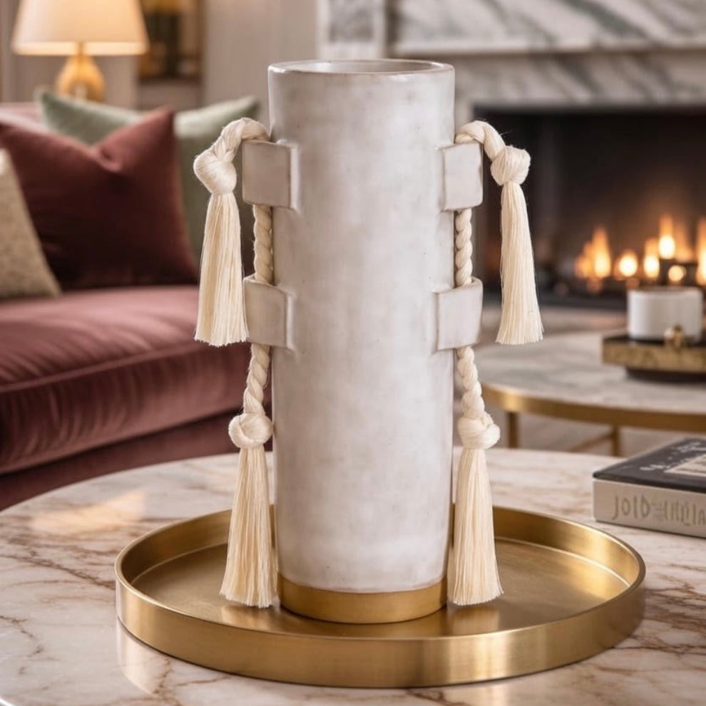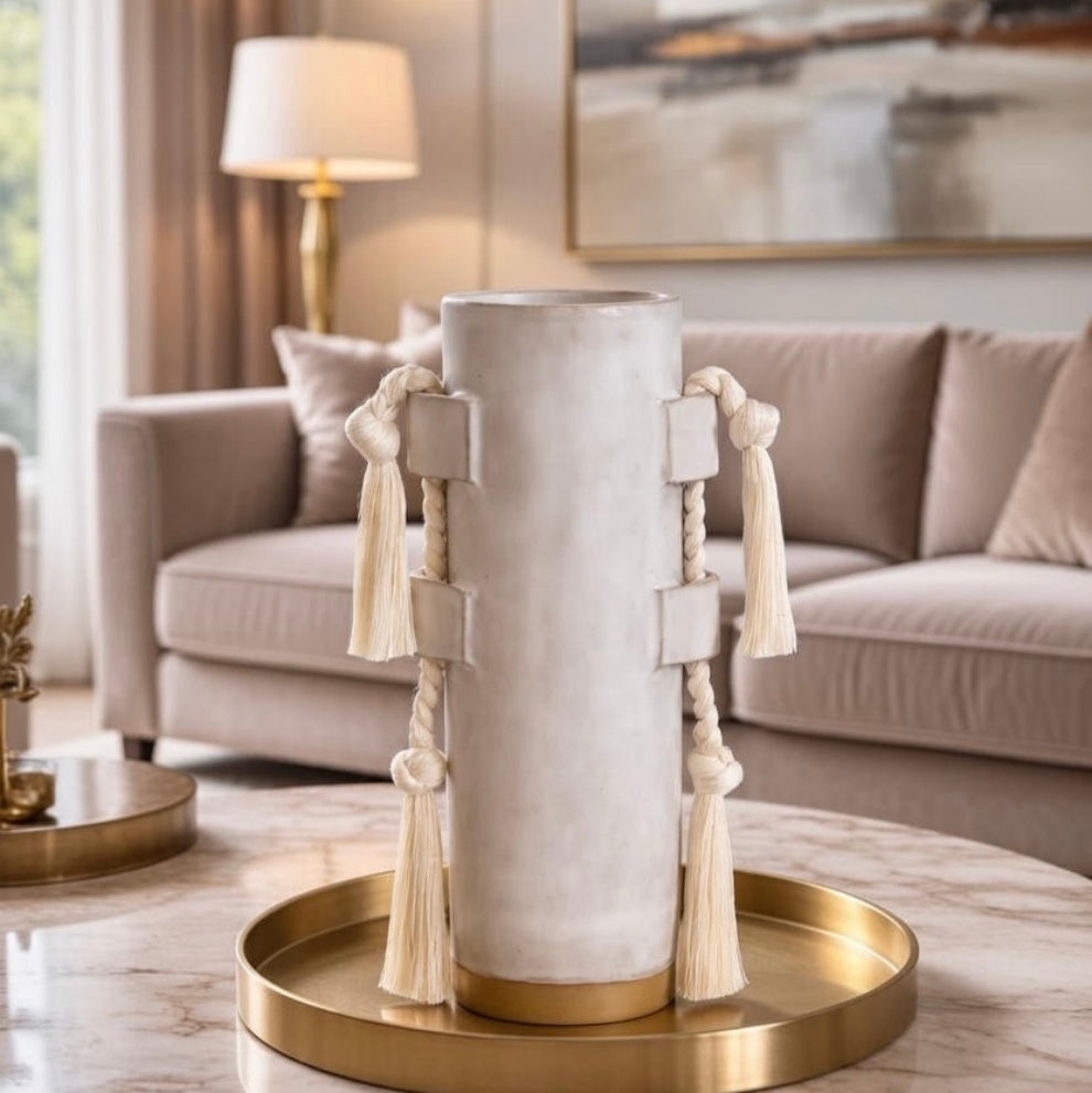 This ceramic vase blends minimalist form with handcrafted charm. The smooth cylindrical body is accented by natural rope details, adding texture and visual interest. Earthy and modern, it’s ideal for styling dried florals or displaying as a standalone decorative piece that brings warmth and balance to your décor.