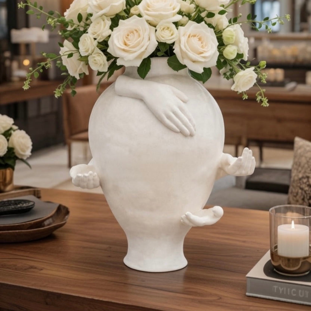 A truly unique decorative vase that merges functionality with sculptural art. Designed with abstract hand elements embracing the form, this piece symbolizes connection, creativity, and expression. Finished in a soft neutral tone, it serves as a stunning standalone accent or a vessel for dried or faux arrangements. Perfect for modern, artistic, or curated interiors, this hand vase adds personality and conversation-worthy charm to your space.