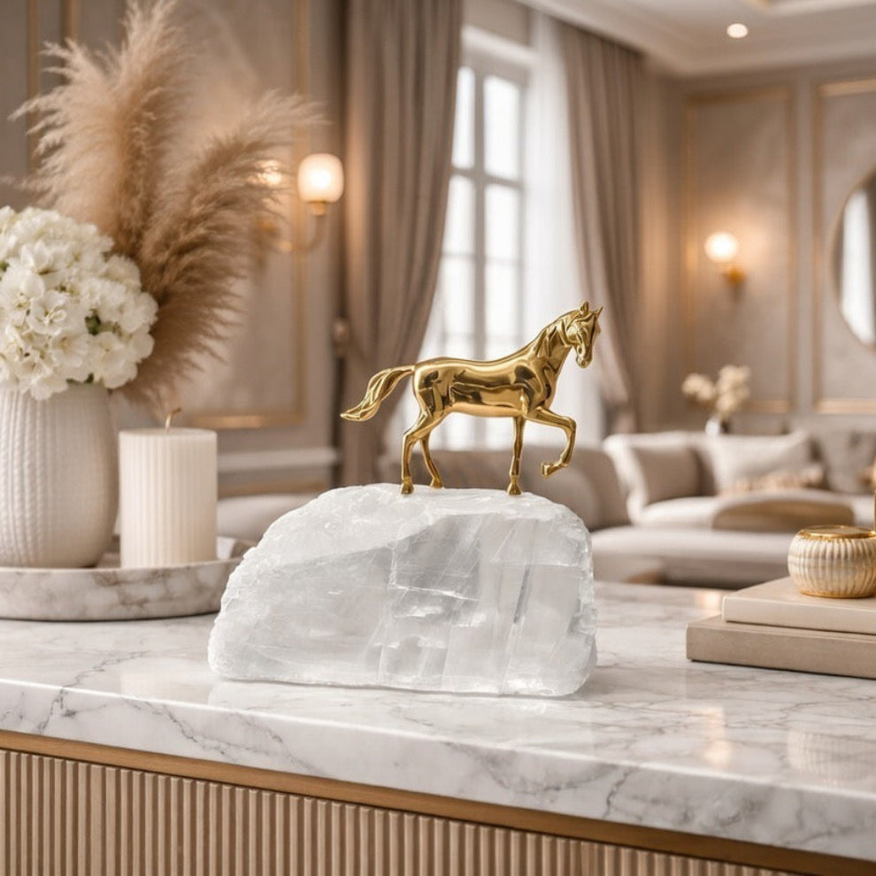 These elegant brass horse figures embody movement, strength, and timeless sophistication. Each sculpture is mounted on a natural quartz crystal base, blending organic texture with polished metallic form. The contrast between the raw crystal and the smooth brass creates a striking visual balance, making these pieces perfect as refined accents for desks, shelves, or curated interiors.