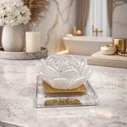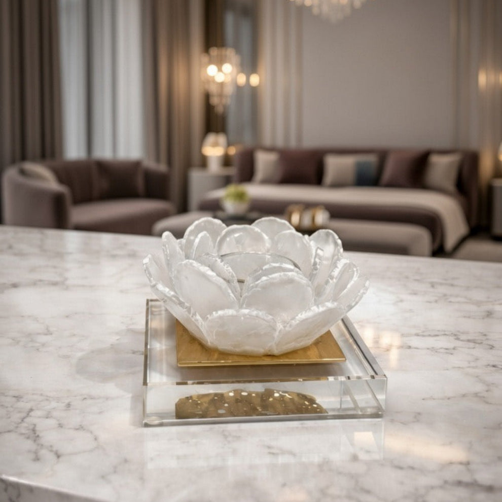 This sculptural glass piece is inspired by the delicate beauty of a blossoming flower. Crafted from crystal-clear glass with softly layered petals, it captures and refracts light to create a luminous, ethereal effect. Set on a sleek square base, it functions as both a decorative object and a statement accent, bringing refined elegance and artistic charm to consoles, shelves, or tabletops.